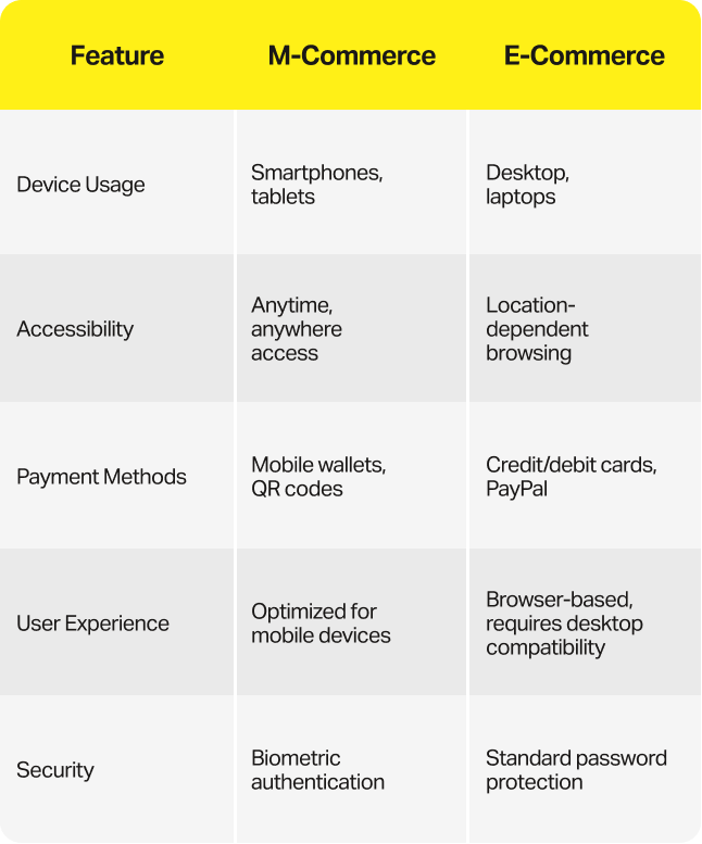 M-commerce and e-commerce share similarities but differ in accessibility, payment methods, and user experience. Mobile commerce enables anytime, anywhere shopping through smartphones and tablets, while e-commerce primarily depends on desktop and laptop access. Mobile wallets, QR codes, and contactless transactions define m-commerce payments, whereas e-commerce traditionally relies on credit/debit cards and PayPal. Security measures in m-commerce often include biometric authentication, while e-commerce platforms focus on password-based protection. The mobile experience is optimized for smaller screens, ensuring a seamless interface, whereas desktop-based e-commerce demands broader compatibility across devices.